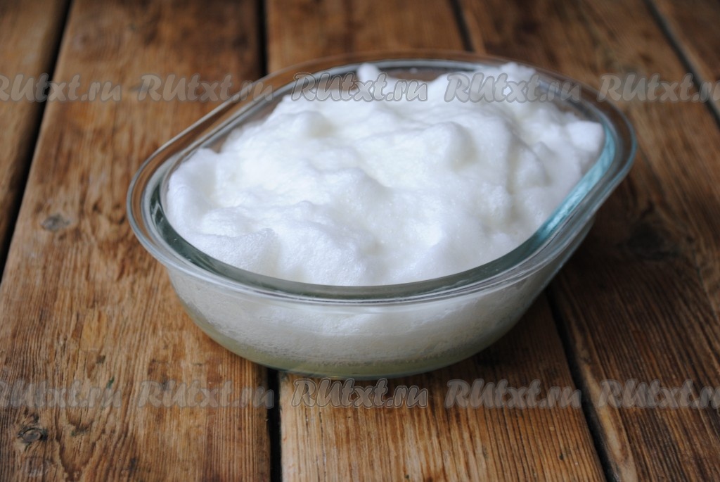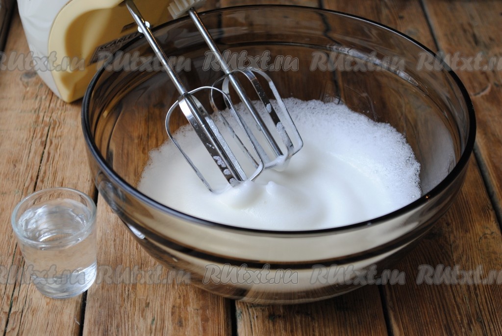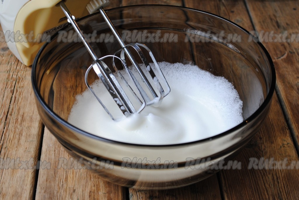 С помощью миксера взбить белки с солью до образования пышной пены.