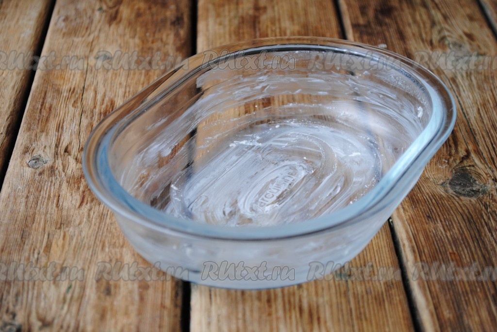 Форму, в которой будем готовить белковый омлет, смазать сливочным маслом. Я использовала одну жаропрочную стеклянную форму, также её можно заменить на силиконовые порционные формочки, которые предназначены для выпекания кексов.