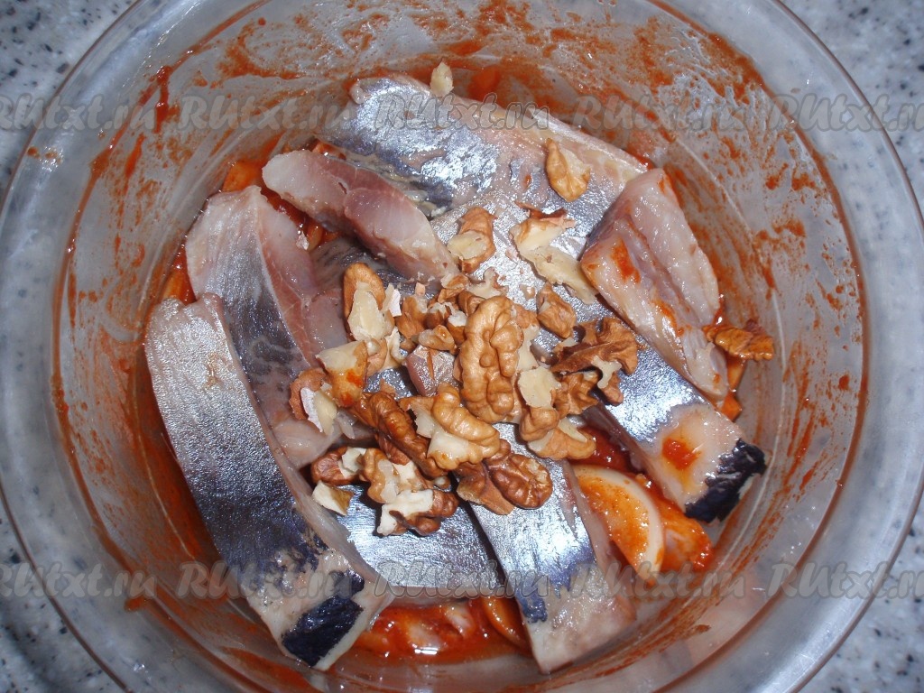 Филе сельди нарезать тонкими полосками, при необходимости удалить косточки. В приготовленную томатную заправку добавить селедку и крупно порубленные грецкие орехи.