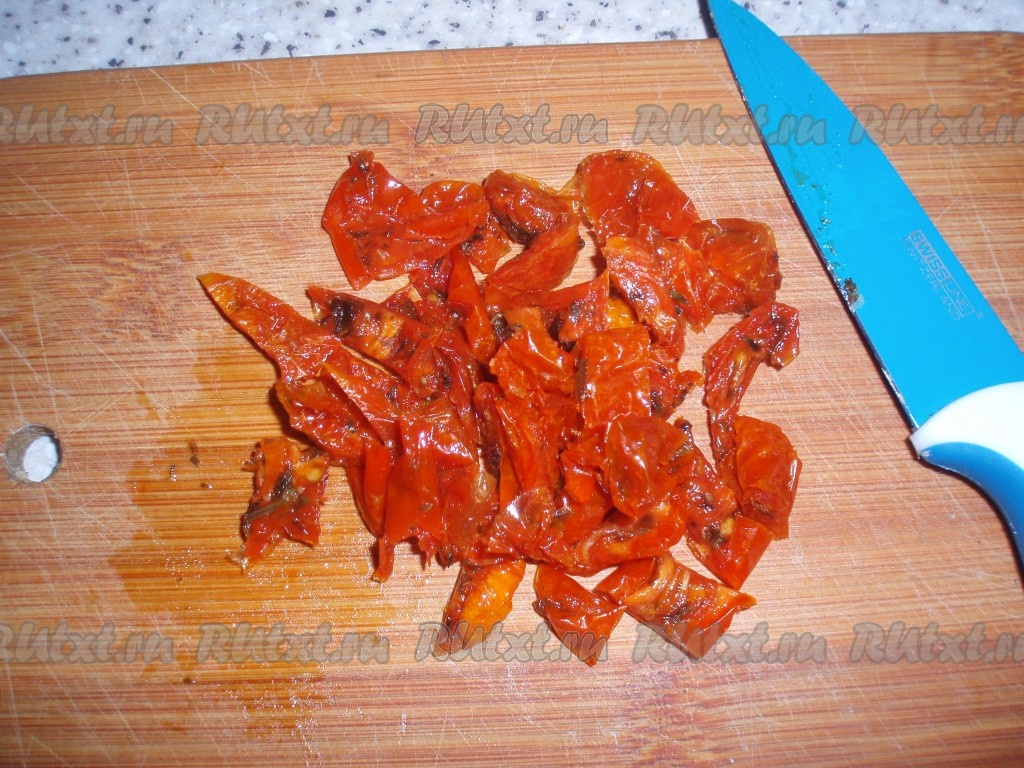 Вяленые помидоры нарезать кусочками, добавить к остальным продуктам.
