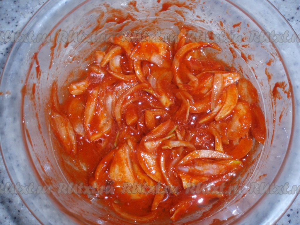 Слить кипяток с лука, добавить к луку томатную пасту, паприку, уксус и растительное масло, перемешать получившуюся томатную заправку.