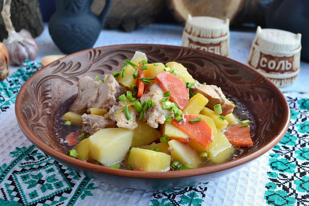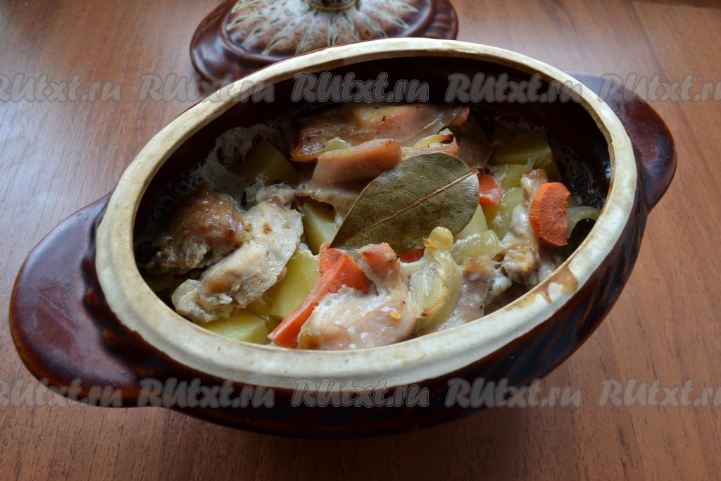 Накрыть горшочек крышкой и поместить его в холодную духовку. Выставить температуру 170 градусов и готовить блюдо около 1,5 часов.