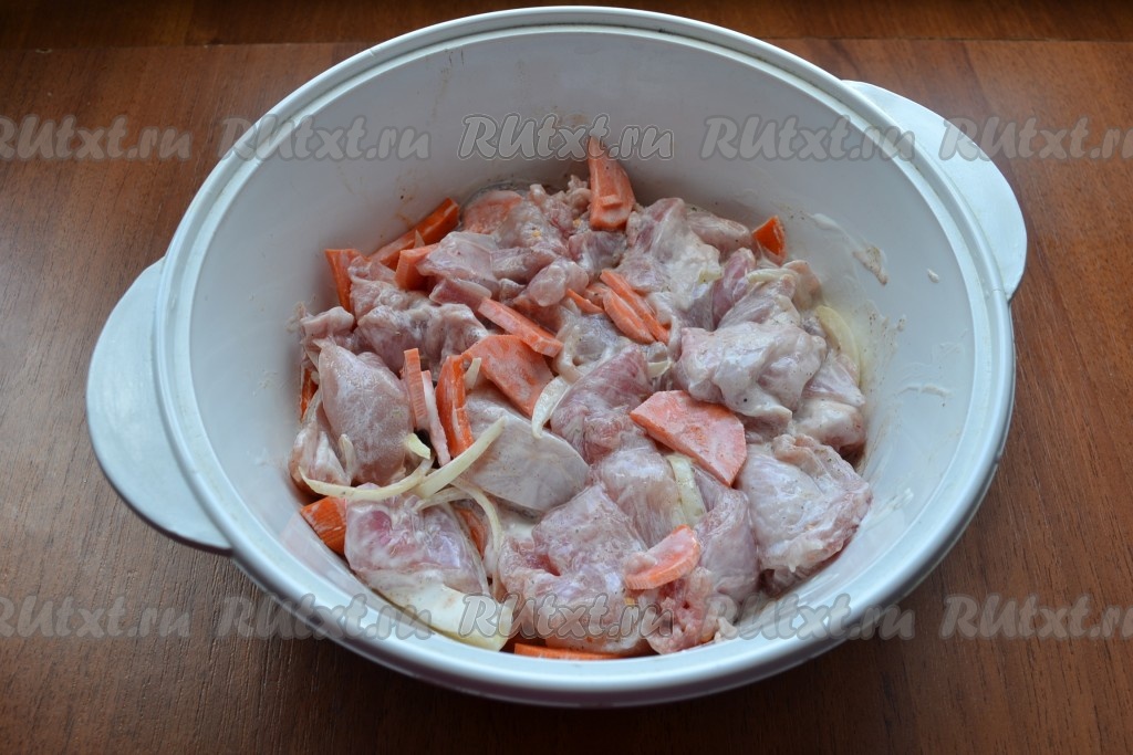 Затем в горшочек выложить половину мяса кролика с луком и морковью.