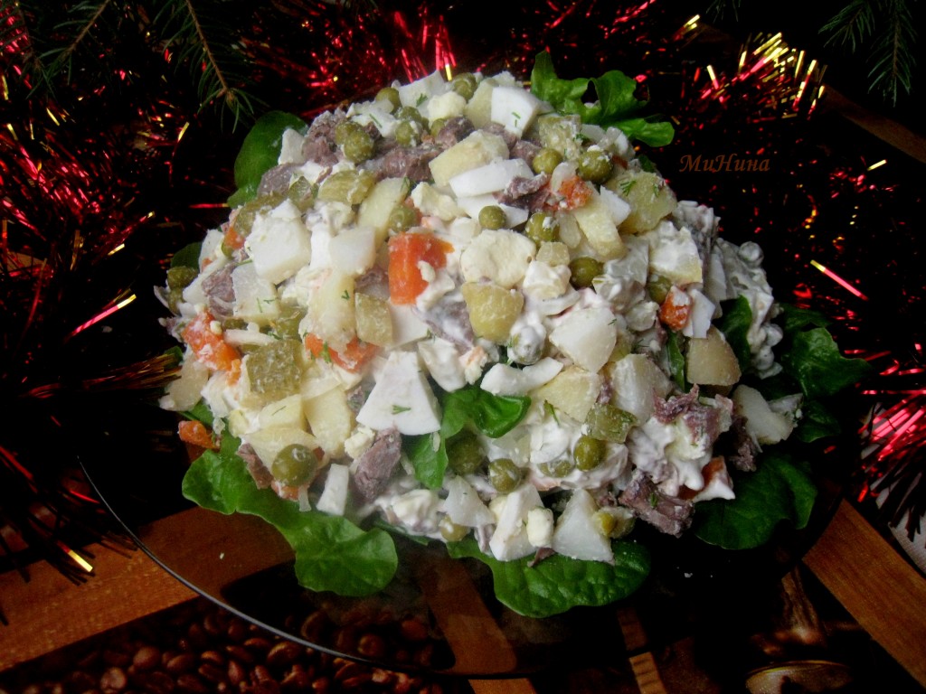Салат "Оливье" - традиционный для новогоднего, да и любого праздничного, стола. Кулинарные историки раскрыли оригинальный рецепт от заморского повара Оливье, но большинство навсегда полюбили, так называемый, "советский" вариант. Мне больше всего нравится "Оливье" с мясом и солёными огурцами. Уверена, этот вариант салата понравится многим!