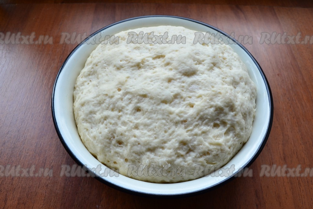 Поместить тесто в миску, прикрыть плёнкой (или полотенцем) и оставить в тёплом месте для подхода на 1 час (до увеличения теста в объёме в 2-3 раза).