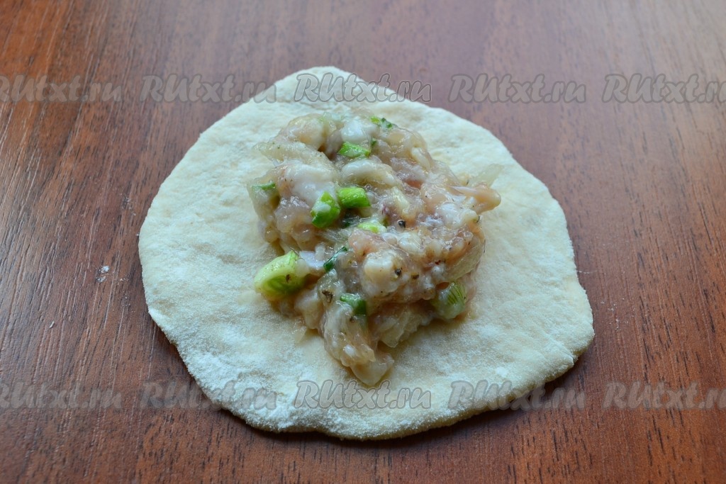 Тесто обмять, разделить на части весом около 40 грамм. Каждую часть немного раскатать и поместить в центр столовую ложку фарша.