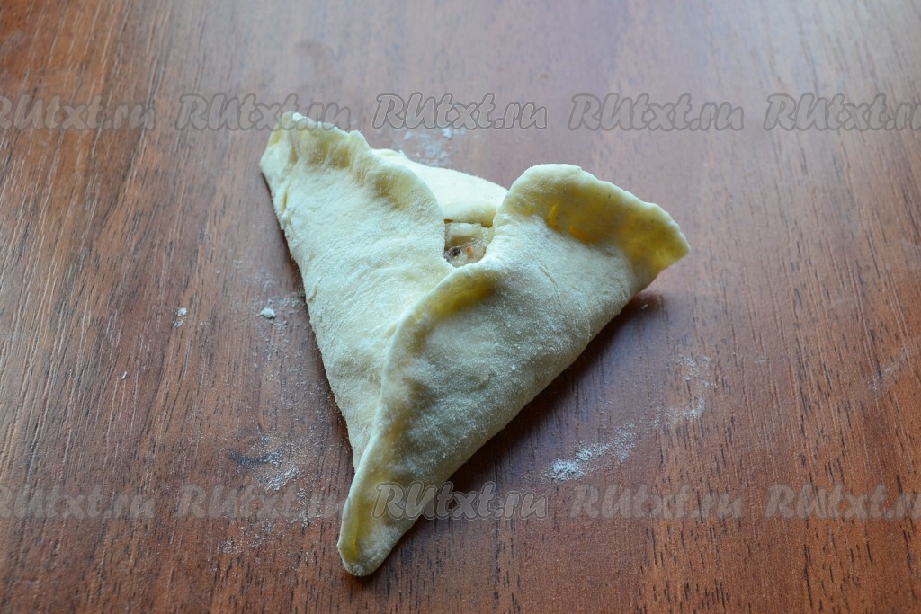 Соединить концы теста в виде треугольника, оставив небольшое отверстие в центре.