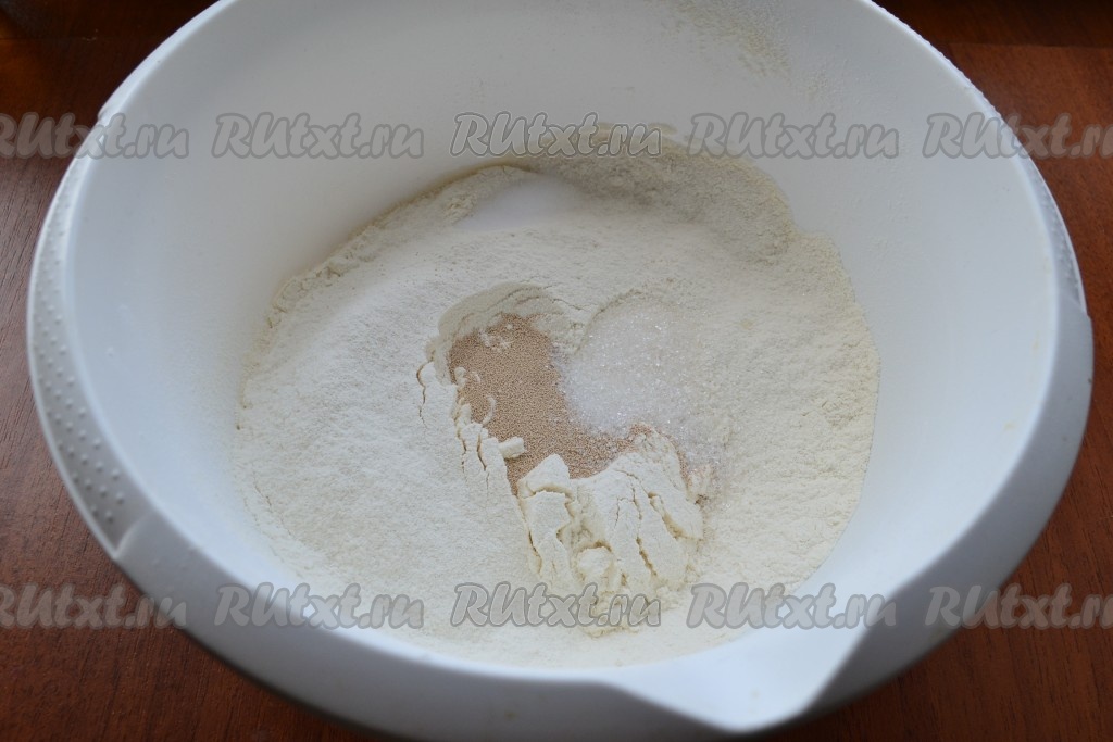 Прежде всего замесим дрожжевое тесто для беляшей. Для этого муку нужно просеять в объёмную миску, всыпать сахар, соль и сухие дрожжи.