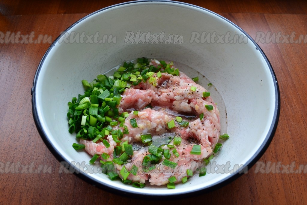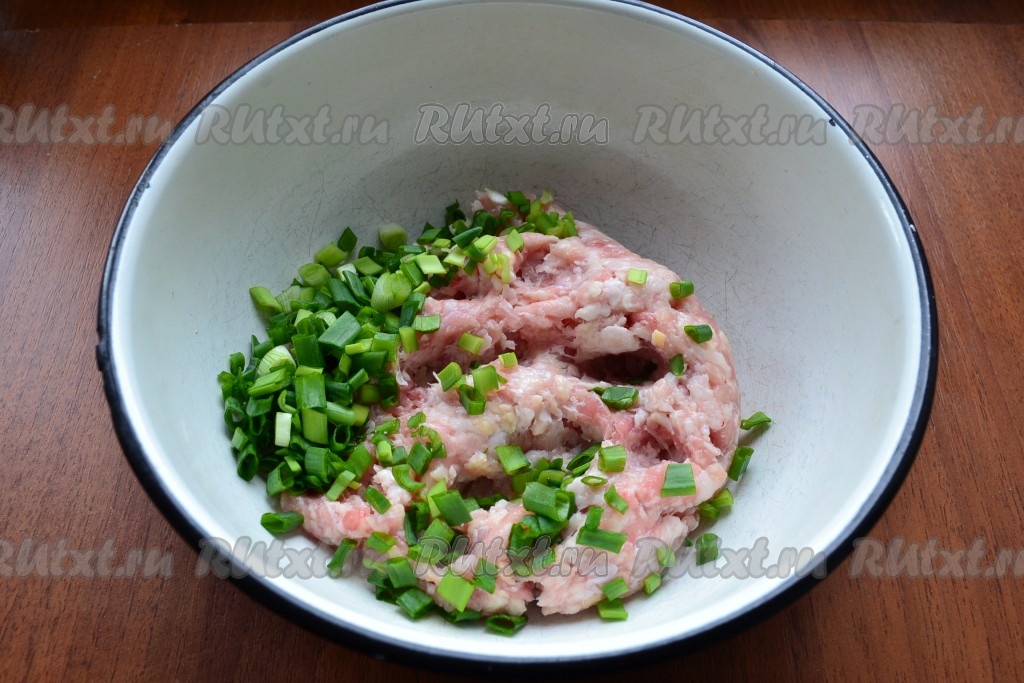 Пока тесто поднимается, займёмся начинкой для беляшей. Зелёный лук нужно промыть водой, обсушить, мелко нарезать. Можно готовить и с репчатым луком, его нужно будет очистить, а затем пропустить через мясорубку (или натереть на крупной тёрке). Фарш можно приготовить в домашних условиях, пропустив кусочки мяса через мясорубку, но можно использовать и покупной фарш. Куриный фарш выложить в миску, добавить измельчённый лук.