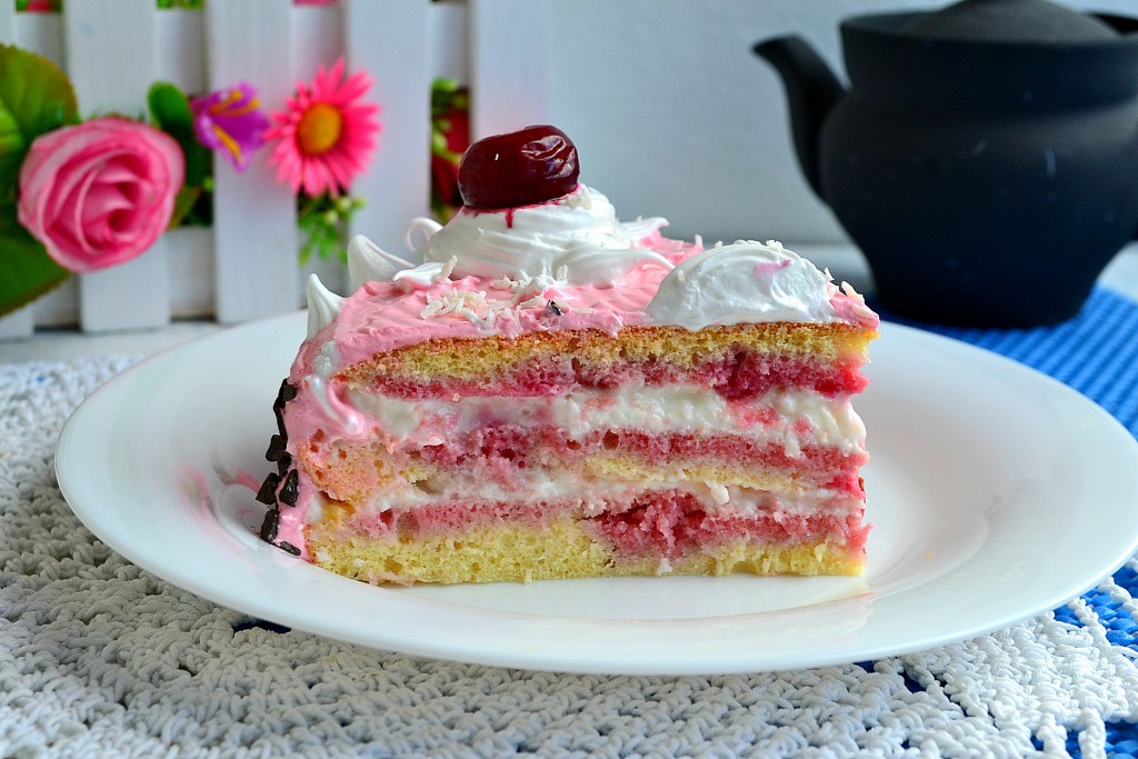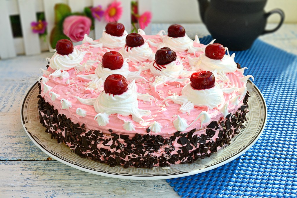 Верх торта смазать оставшимся сметанным кремом (я верх и бока торта смазала сметанным кремом, добавив в него чуть-чуть вишнёвого сока, но подкрашивать крем необязательно). Поместить торт в холодильник минимум на 4 часа и можно подавать к столу. Перед подачей я украсила торт сверху взбитыми сливками и ягодами вишни. Бока торта можно посыпать осколками шоколада или натёртым шоколадом.