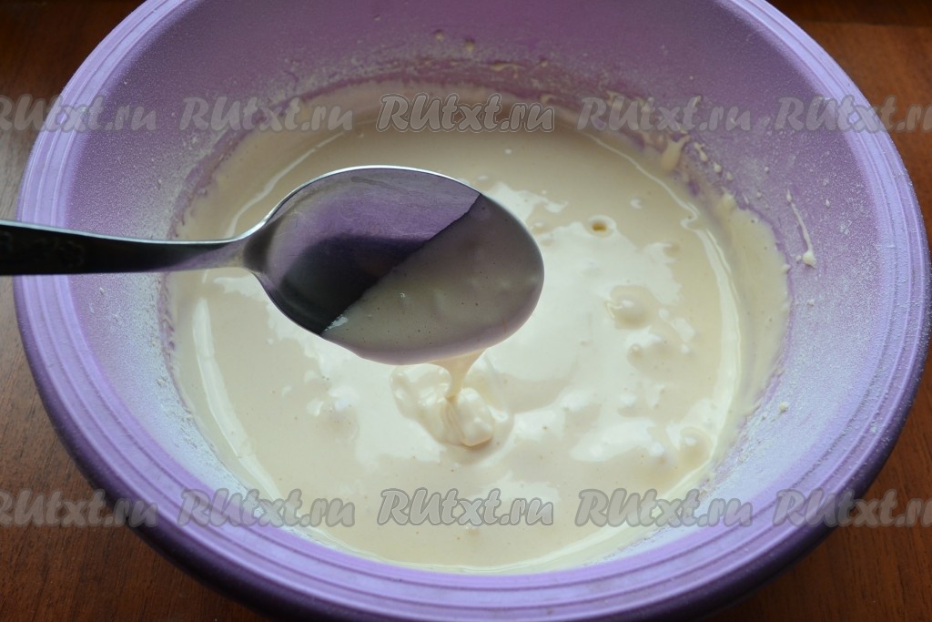 Добавляя понемногу просеянную муку, взбивать дальше на минимальной скорости миксера, замешивая тесто. Тесто получится не очень густым, как на фото, будет напоминать тесто на оладьи.