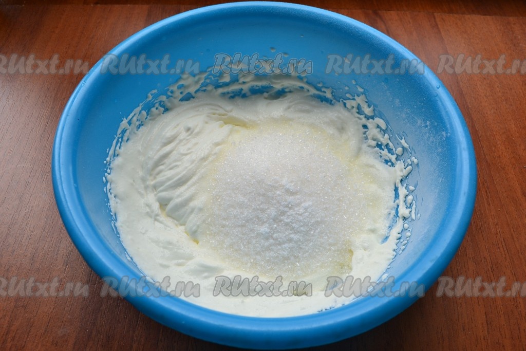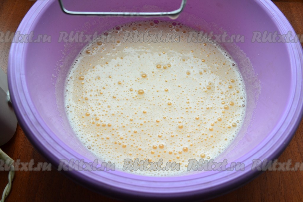 Взбить яйца миксером до пышной пены, далее, частями всыпая сахар, продолжать взбивать до светлой и пышной массы (минут 10).