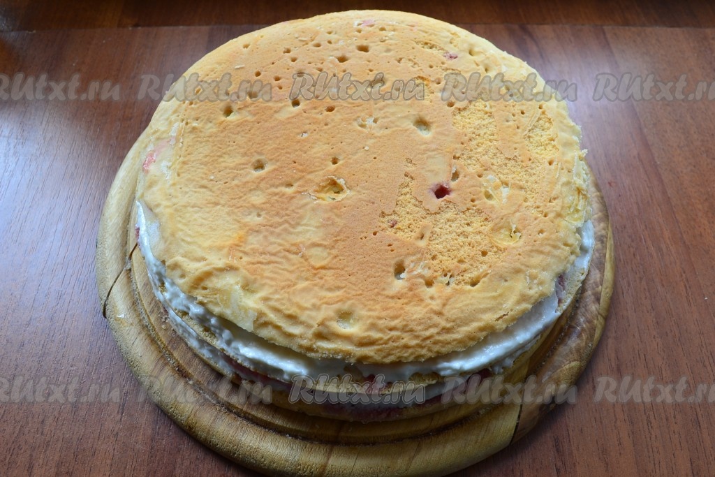 Сверху разместить вторую часть бисквита и также смазать кремом и выложить оставшуюся вишню. Накрыть последней частью бисквита.