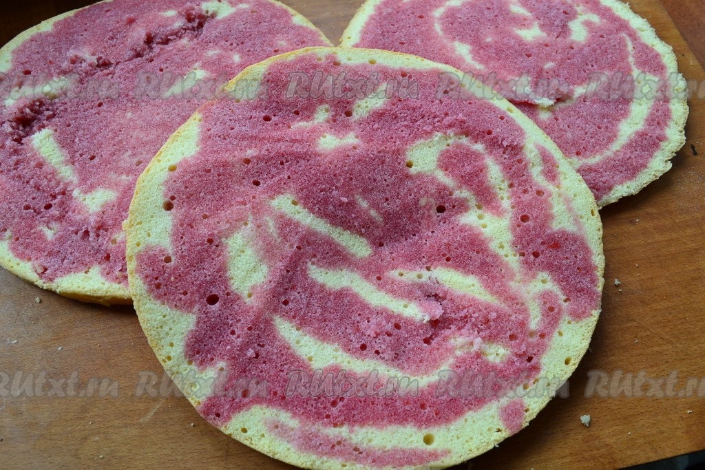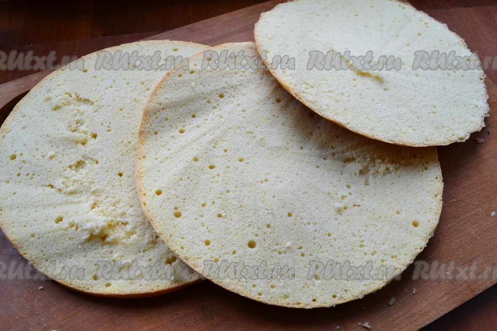 Полностью остывший бисквит разрезать на 3 части.