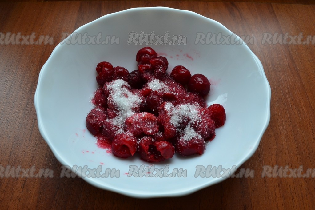 Для приготовления начинки вишню свежую (или замороженную), поместить в миску, всыпать сахар, перемешать. Оставить на 20-30 минут, вишня выделит сок.