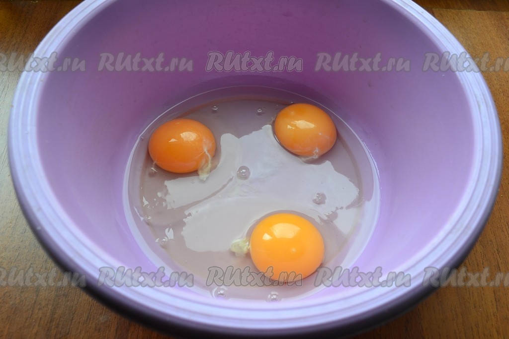 Прежде всего замесим тесто для бисквита, для этого в глубокую миску нужно разбить яйца, добавить щепотку соли.