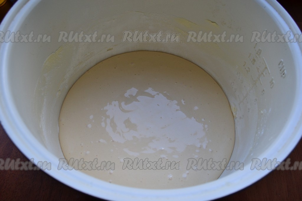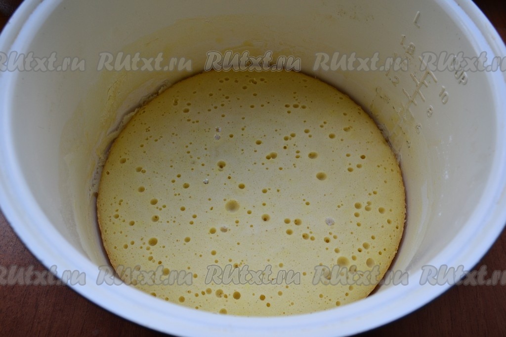 Я выпекала бисквит в мультиварке, чуть ниже расскажу, как испечь в духовке. Чашу мультиварки смазать сливочным маслом и присыпать немного мукой. Выложить подготовленное тесто, крышку мультиварки закрыть.