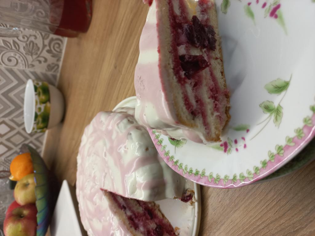 А вот как выглядит бисквитный торт с вишней и сметанным кремом в разрезе.