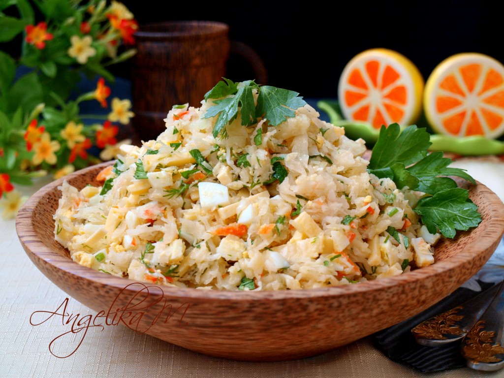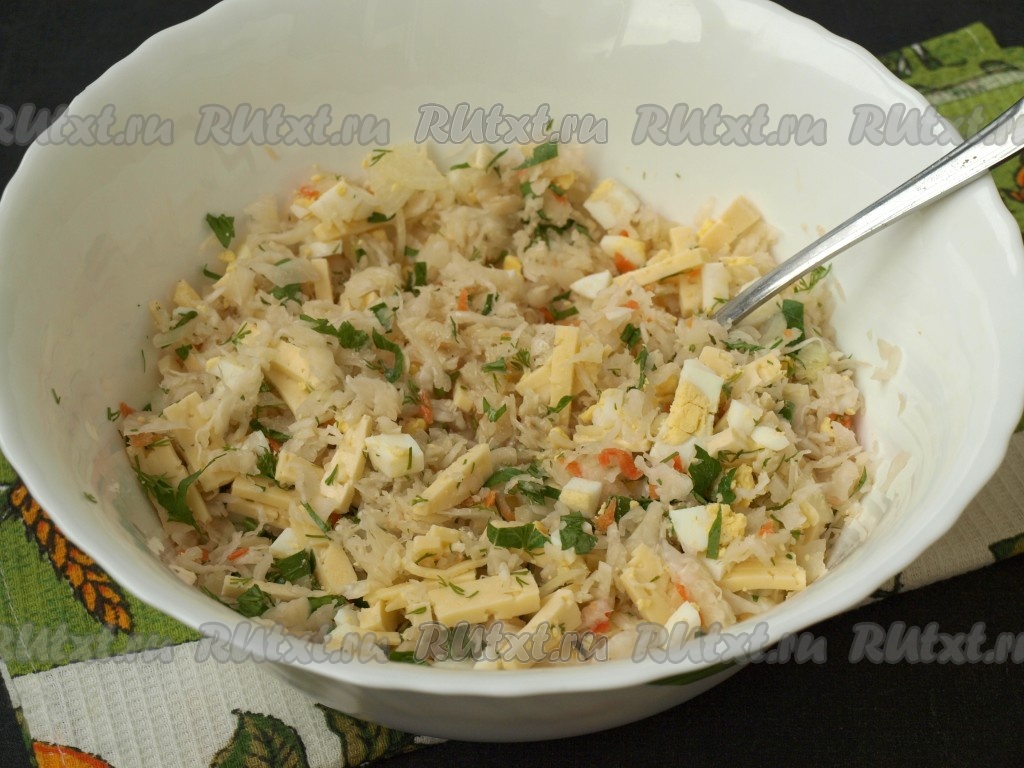 Предлагаю вам приготовить оригинальный и очень вкусный салат с квашеной капустой. В этом салате капуста соединяется с сыром и яйцами, а также дополняется луком и петрушкой. Вкус получается бесподобный. Заправка из лимонного сока с маслом и мёдом также отлично сочетается со всеми ингредиентами.