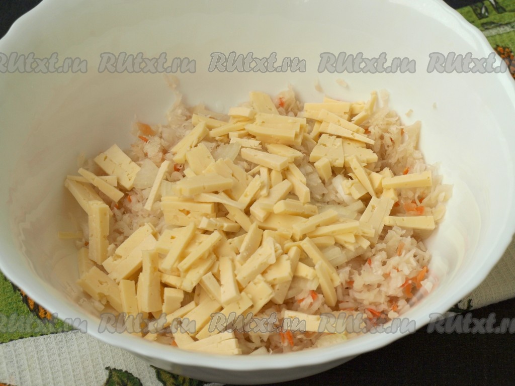 Соломкой нарезать твёрдый сыр, выложить его в салат с квашеной капустой и луком, перемешать.
