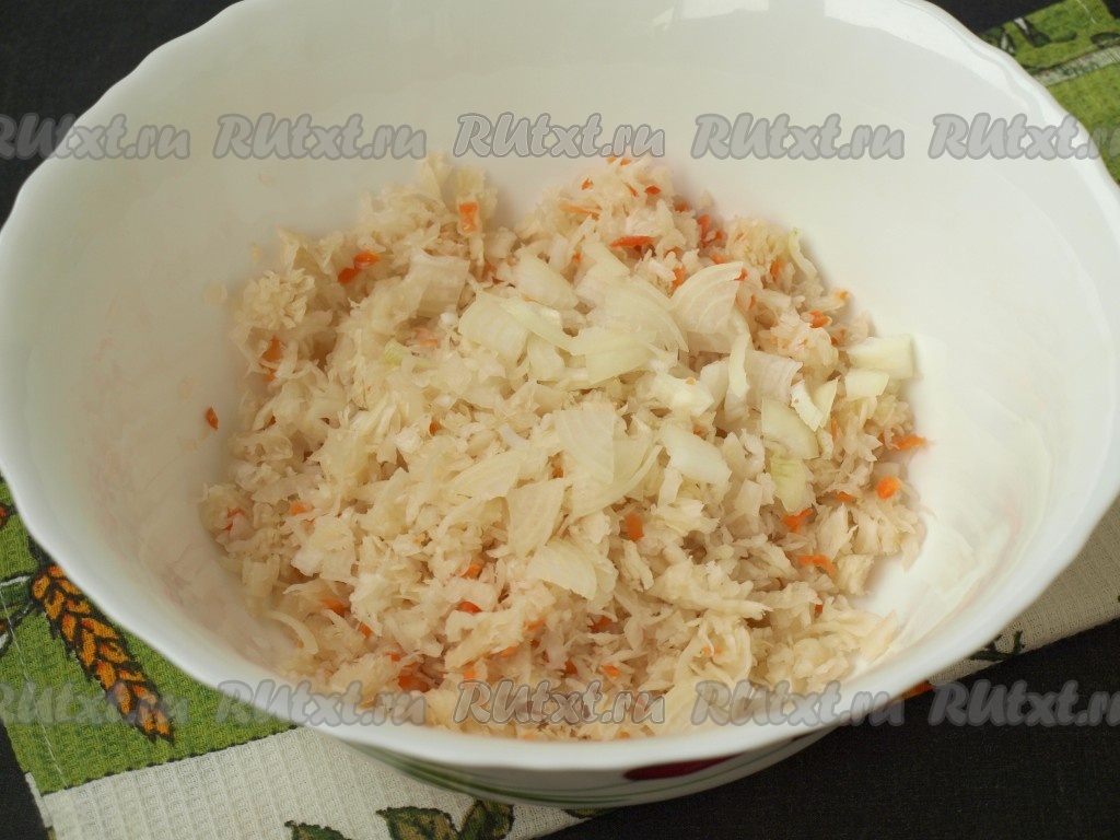 Квашеную капусту нарезать мелко. Добавить нарезанный четверть кольцами лук. Много лука добавлять не стоит, достаточно четвёртой части средней луковицы.
