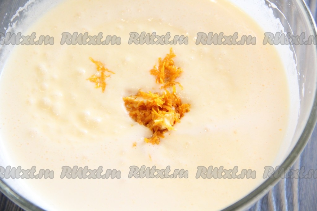 Затем добавить апельсиновый сок и цедру. Ещё раз взбить.
