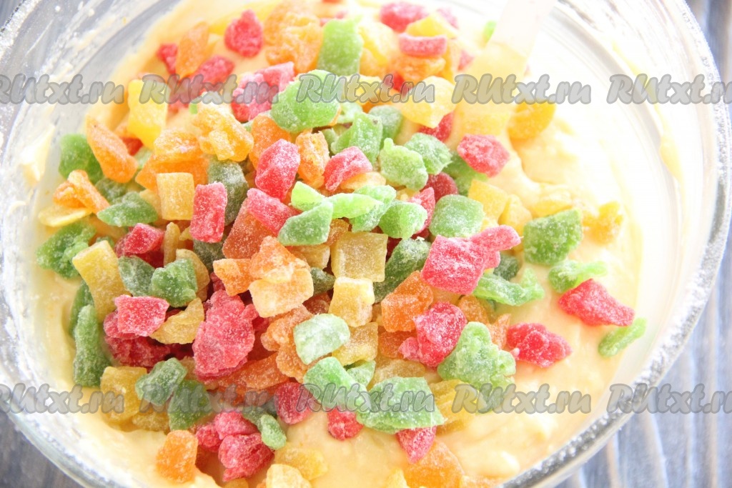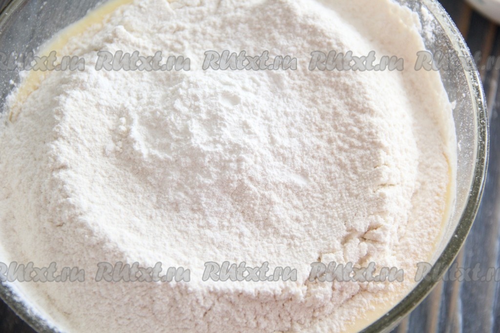 Добавить в получившуюся массу просеянную муку и разрыхлитель.