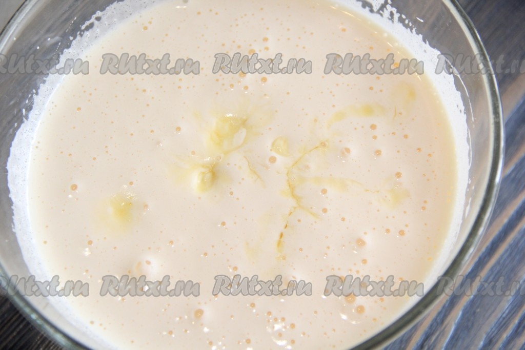 Добавить растопленное масло в яичную смесь и слегка взбить до однородности.