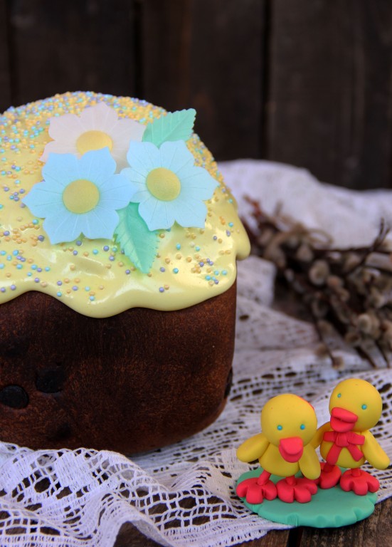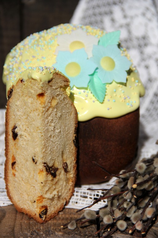 Я покрыла остывший кулич белковой глазурью, слегка подкрасив её пищевым красителем. Для приготовления белковой глазури 1 яичный белок соединить с 3 столовыми ложками сахарной пудры, хорошо взбить, в конце добавить 1 столовую ложку горячего кипятка и пищевой краситель, ещё раз взбить.