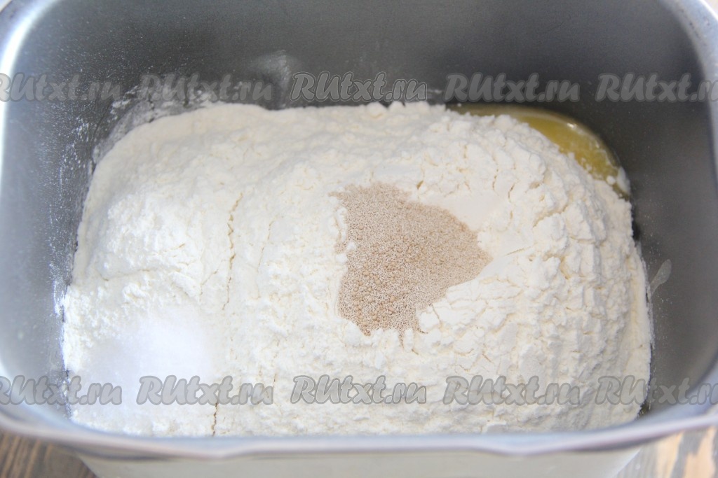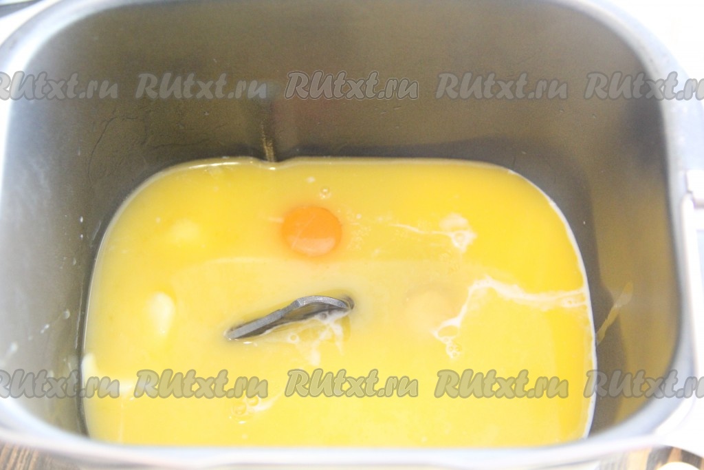 Сливочное масло (или маргарин) растопить, охладить до тёплого состояния и добавить в ведёрко хлебопечки.