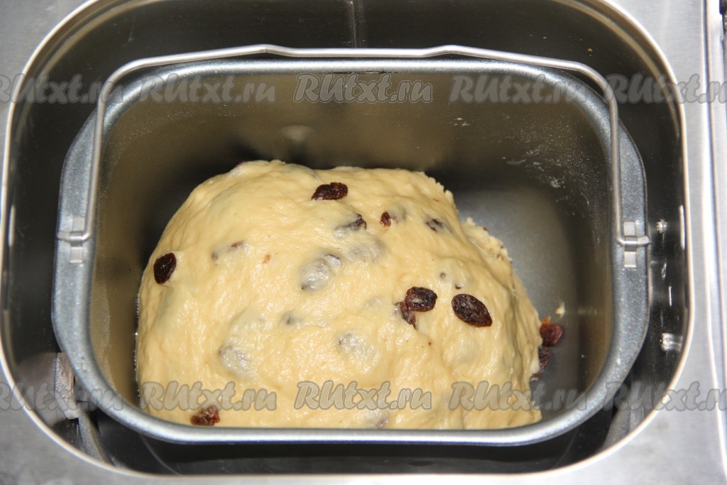 Выставить режим хлебопечки "Основной" или "Белый хлеб", примерное время 3 часа 20 минут. По звуковому сигналу добавить изюм. Колобок должен получиться не липким и эластичным.