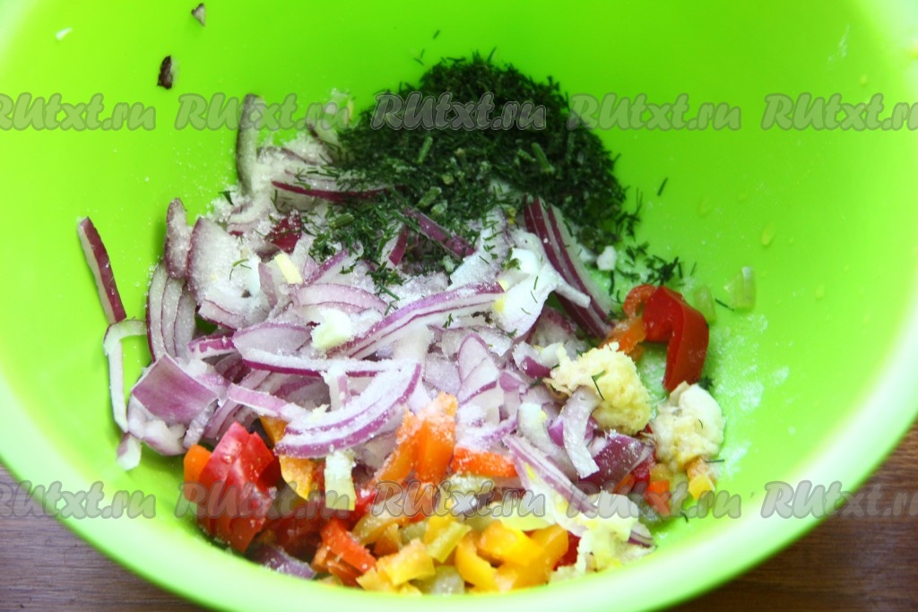 Нарезанные лук, болгарский перец и зелень смешать с сахаром и пропущенным через пресс чесноком.