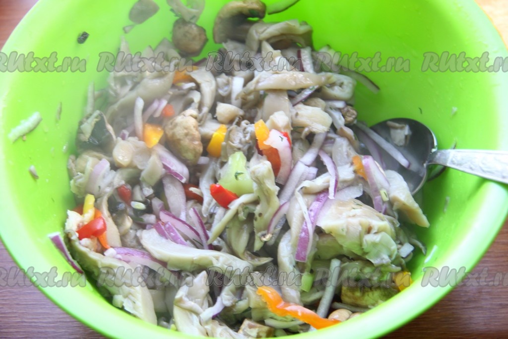В получившуюся смесь зелени и овощей добавить отваренные вешенки, аккуратно перемешать.