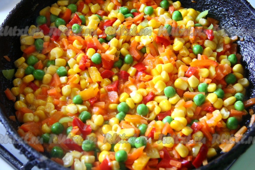 Очищенную морковь мелко нарезать. Болгарский перец, очищенный от семян, тоже нарезать. На сковороде разогреть растительное масло, выложить нарезанные морковь и перец, обжарить в течение 5 минут на среднем огне, периодически помешивая, затем добавить кукурузу и горошек. Тушить все овощи под крышкой еще, примерно, 10 минут, иногда перемешивая.