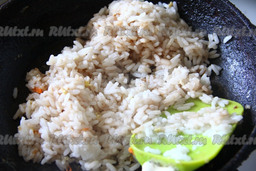 Рис залить 2 стаканами воды, добавить немного соли и варить до готовности, затем, если вдруг останется вода, её нужно слить. На сковороде растопить сливочное масло, влить соевый соус, добавить готовый рис, перемешать, чтобы соевый соус и масло равномерно впитались в рис. Обжарить рис на сковороде на небольшом огне в течение 5 минут, иногда перемешивая.