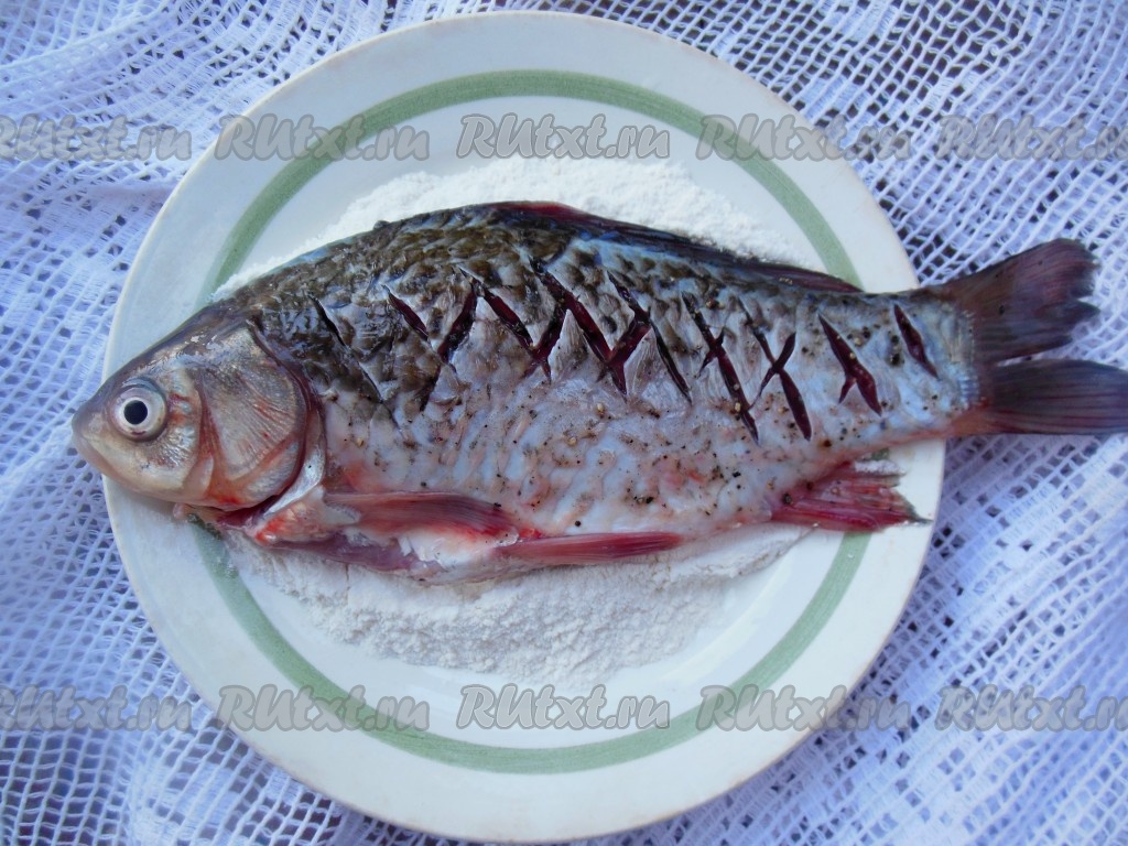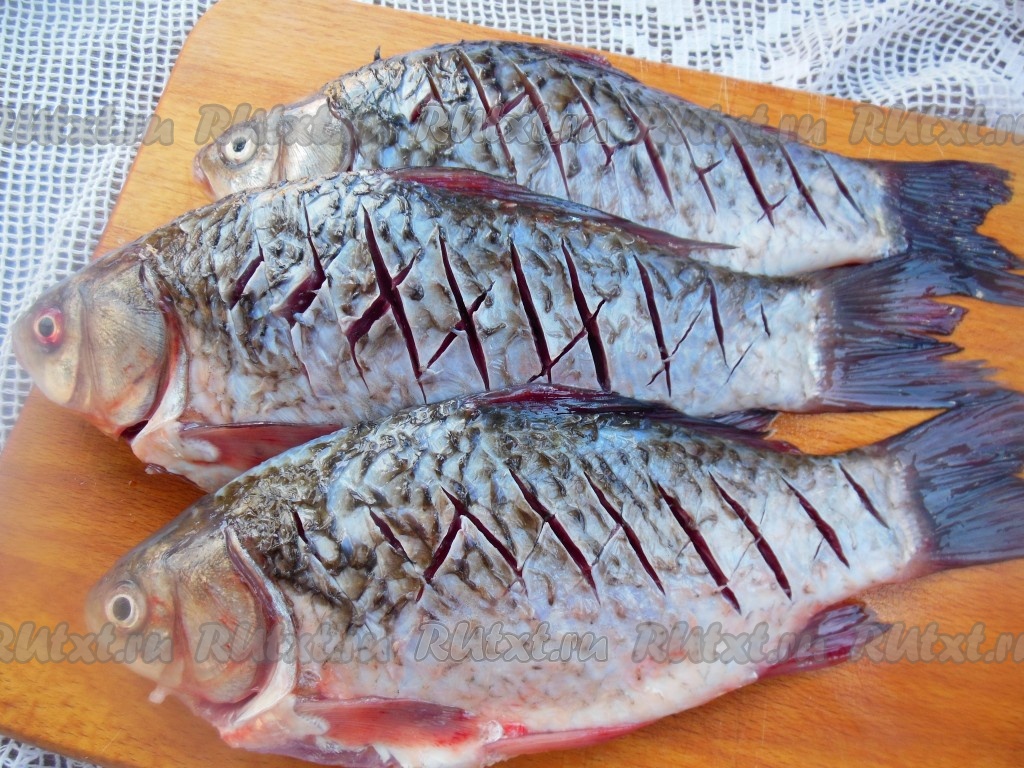 Хорошо промойте карасей под проточной водой, уберите черную пленочку внутри. Если рыба крупная - ее можно разрезать на куски. На поверхности рыбы (с двух сторон) сделайте острым ножом насечки "крест-накрест" от спины к брюшку (не слишком глубоко, как на фото), это нужно для того, чтобы мелкие косточки не чувствовались после жарки.