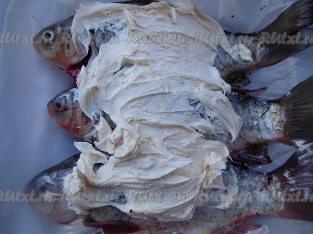 Форму для запекания застелите пергаментом или смажьте маслом (я запекала в жаропрочной стеклянной форме), выложите карасей. Рыбу сверху щедро смажьте сметаной.