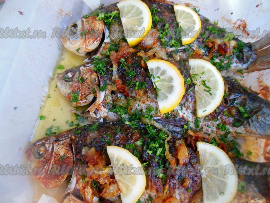 Очень вкусных карасей, запеченных со сметаной в духовке, при подаче можно посыпать жареным луком и мелко нарезанной зеленью, полить лимонным соком.