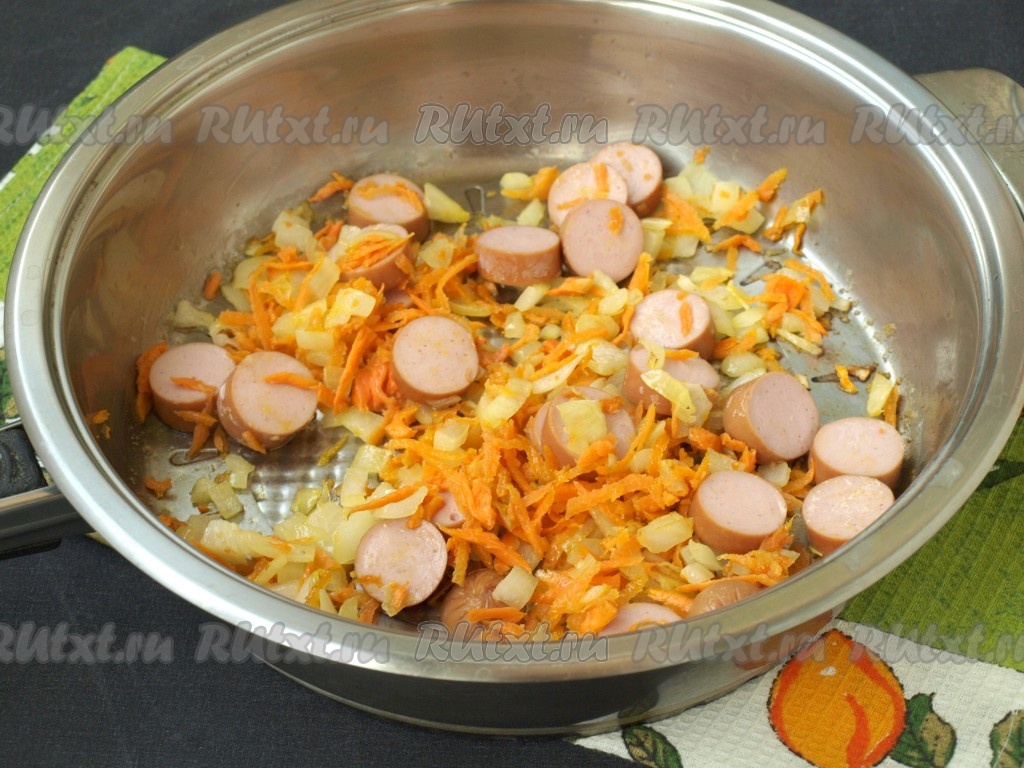 Кружочками нарезать сосиски, добавить их к обжаренным овощам, готовить ещё несколько минут, иногда перемешивая.