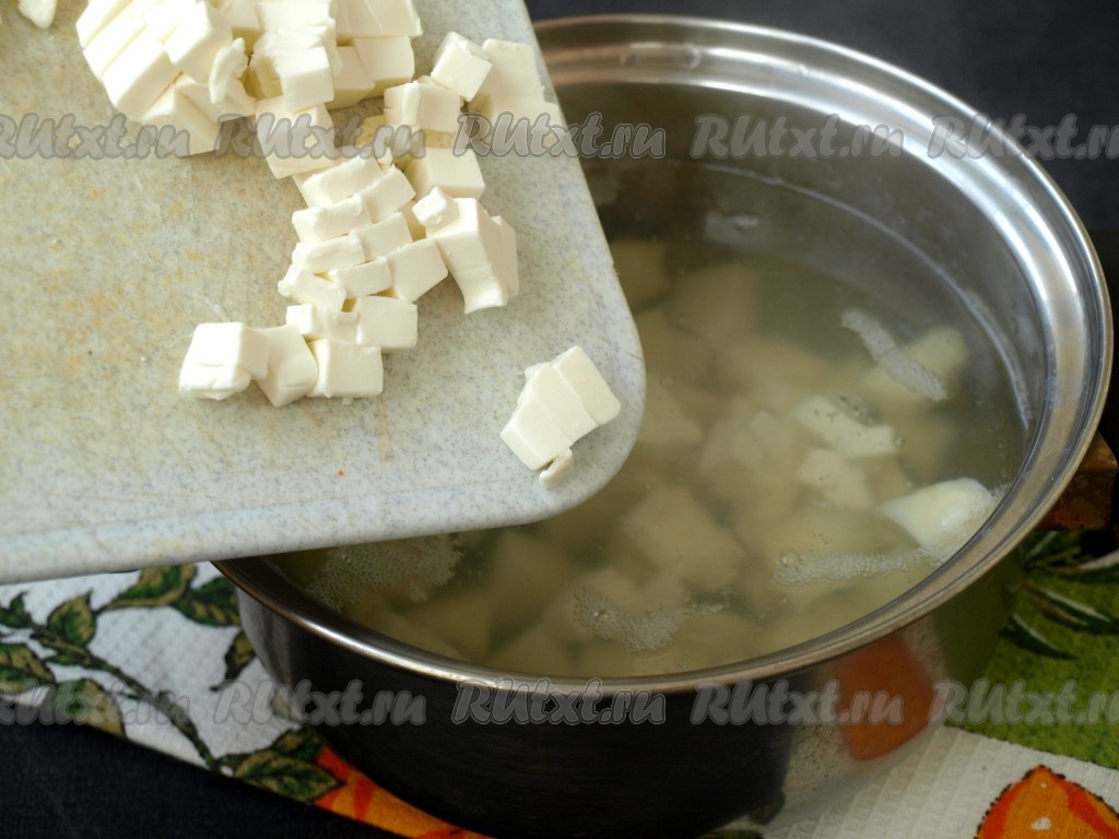 Кубиками нарезать плавленный сырок. Когда картофель сварится, в кастрюлю выложить кубики сыра, размешать до полного растворения.