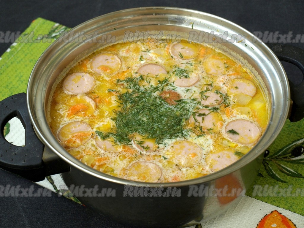 Затем в кастрюлю добавить сосиски, обжаренные с луком и морковью, укроп, соль и перец по вкусу. Варить суп 2 минуты.