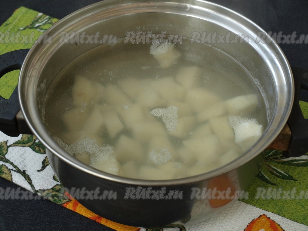 В кастрюлю налить 1 литр воды, довести до кипения. Картофель очистить, нарезать кубиками, выложить в кипящую воду и варить на небольшом огне до готовности.