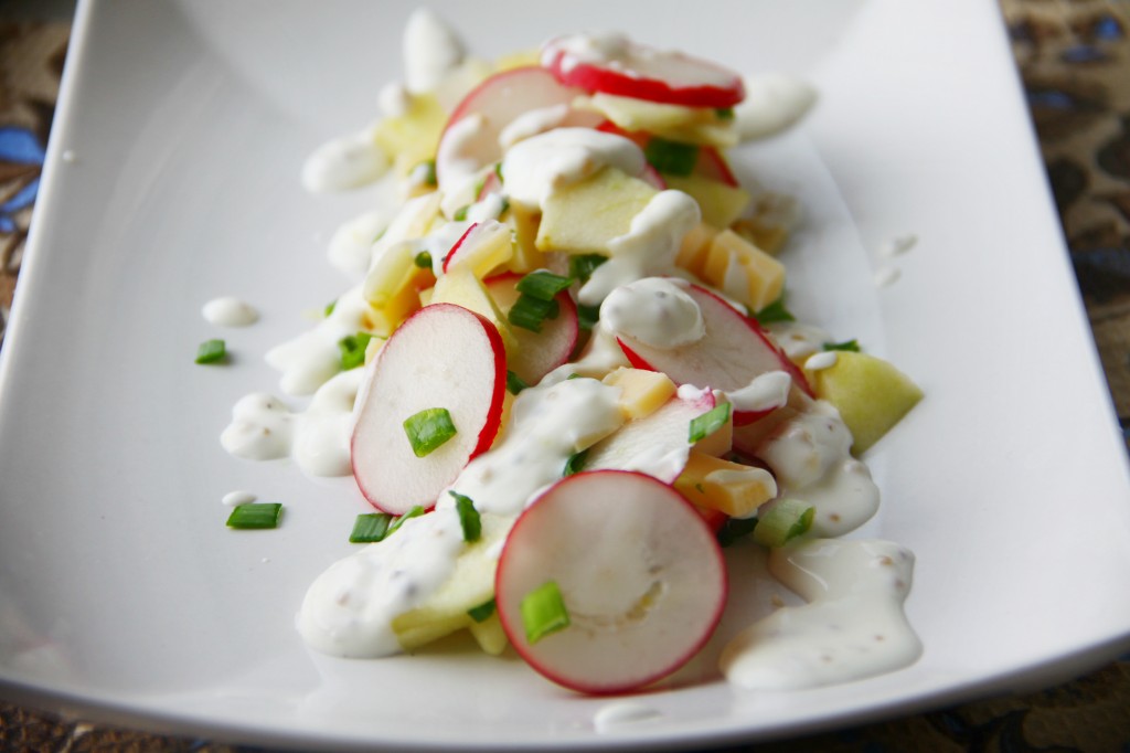 Полить заправкой и сразу подать сочный, вкусный салат из редиски, сыра и яблока к столу.