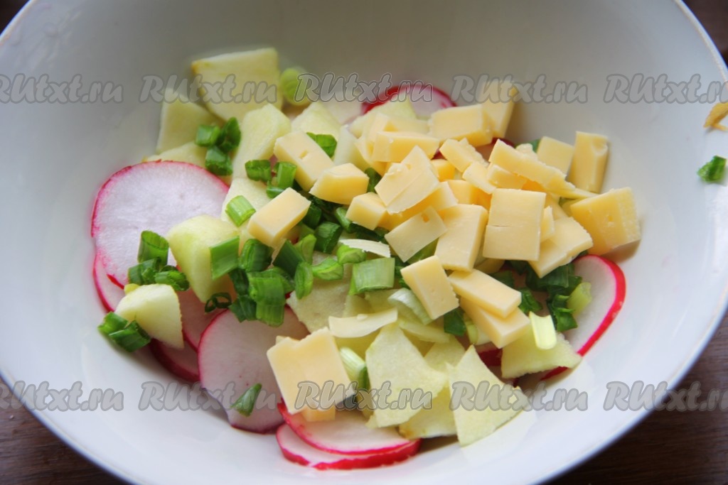 Лук измельчить, сыр нарезать кубиками или натереть на терке и добавить в салат из редиски и яблока.