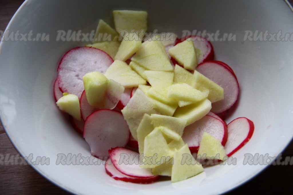 Яблоко, очищенное от шкурки и семян, нарезать кубиками и добавить к редиске.