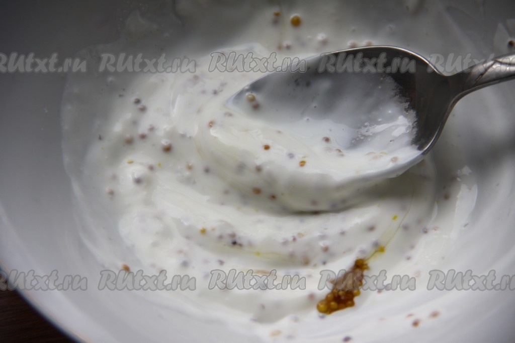 Для приготовления заправки к йогурту (или сметане) добавить горчицу, мед и соль, перемешать.