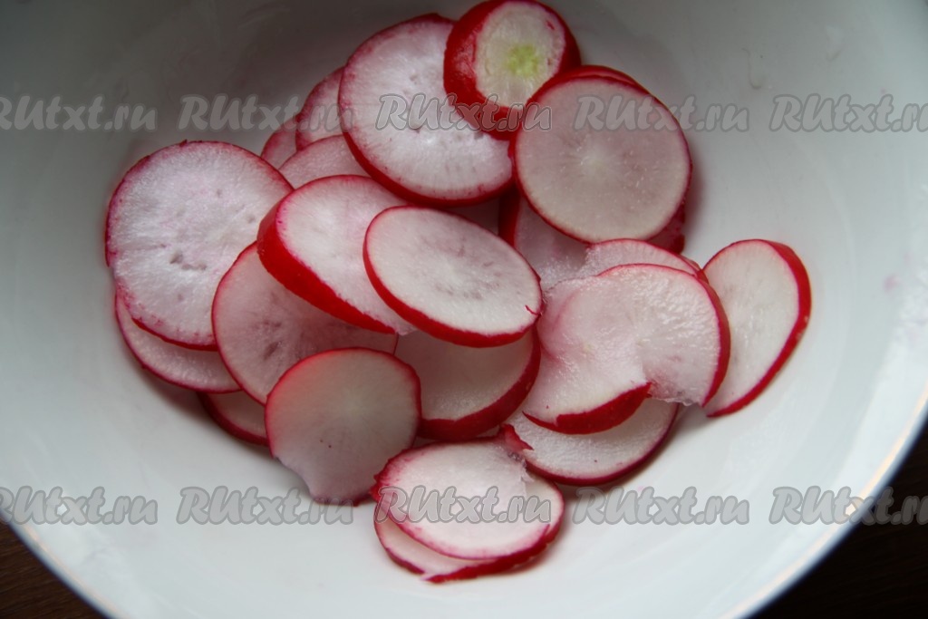 Редиску вымыть, обсушить, нарезать кружочками.
