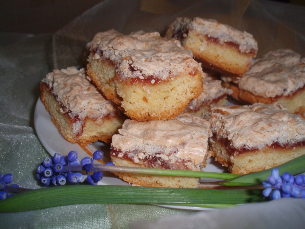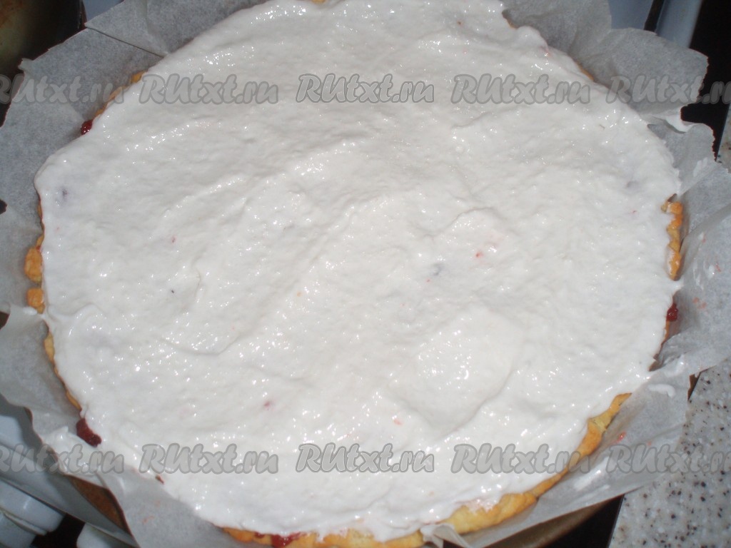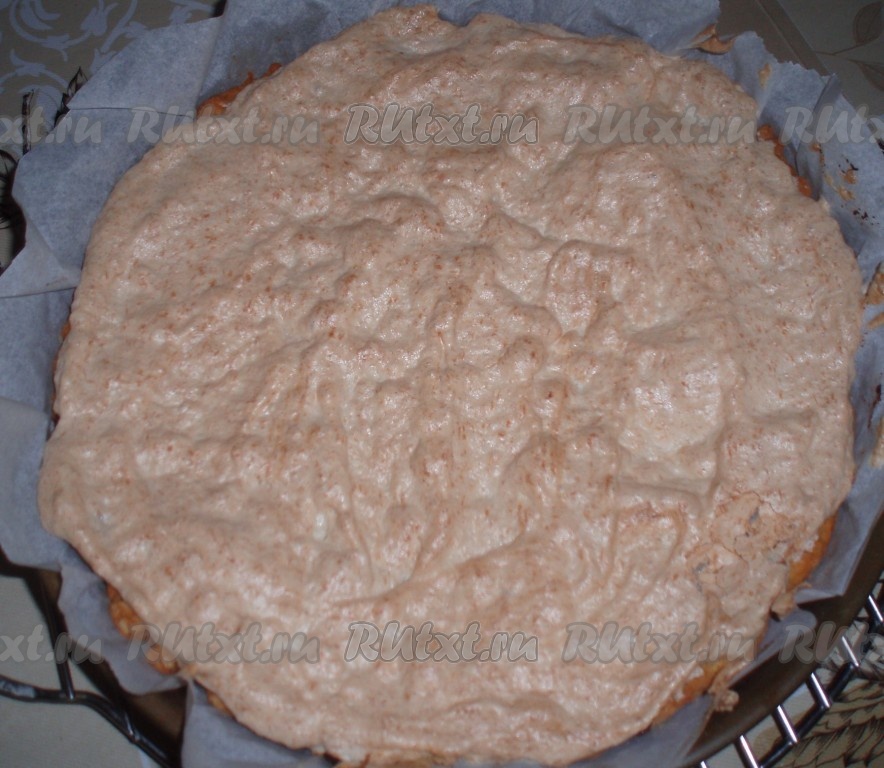 сверху выложить кокосовое безе. Температуру духовки уменьшить до 170 градусов. Печь песочный пирог, примерно, 40 минут. Безе должно стать совершенно сухим.