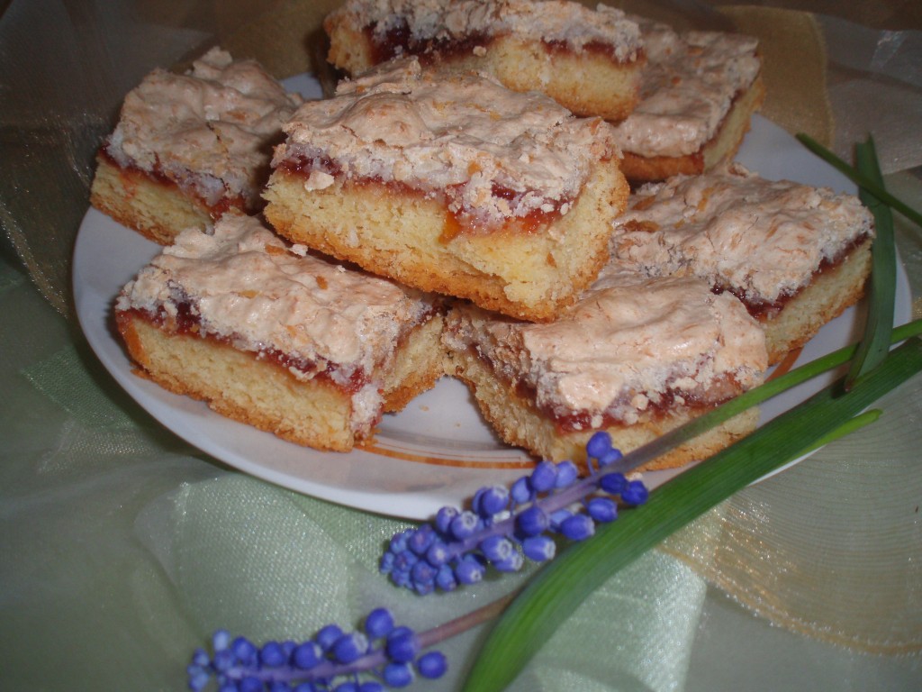 Очень вкусный, рассыпчатый песочный пирог с хрустящим безе нарезать на порции и подать к чаю.