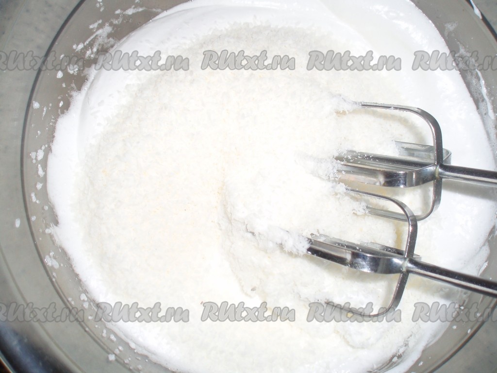 Когда пена будет уже устойчивой, всыпать кокосовую стружку и аккуратно перемешать.